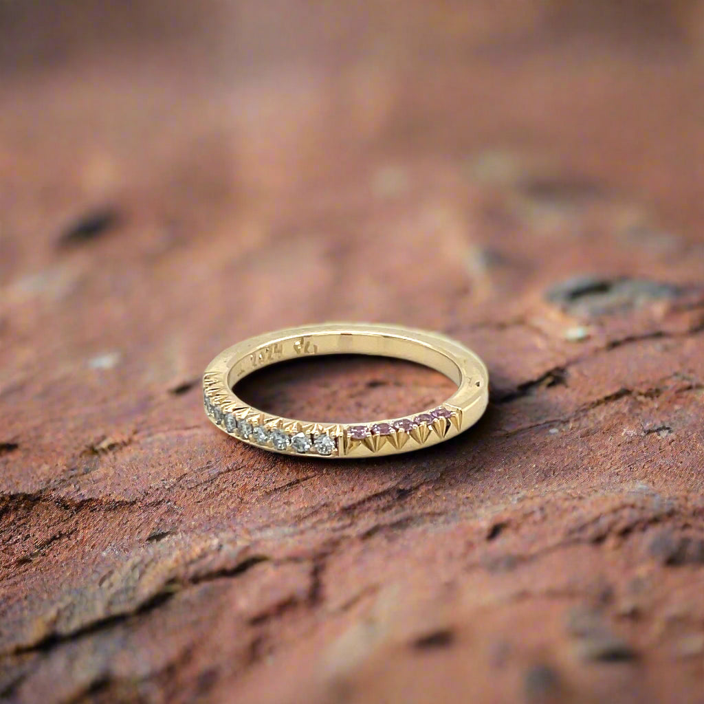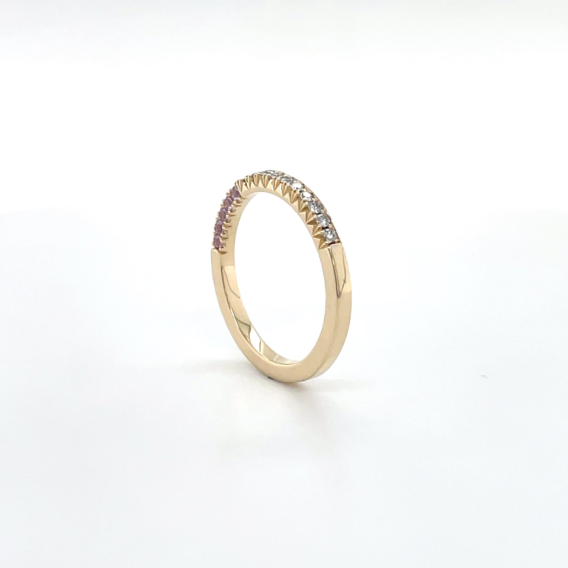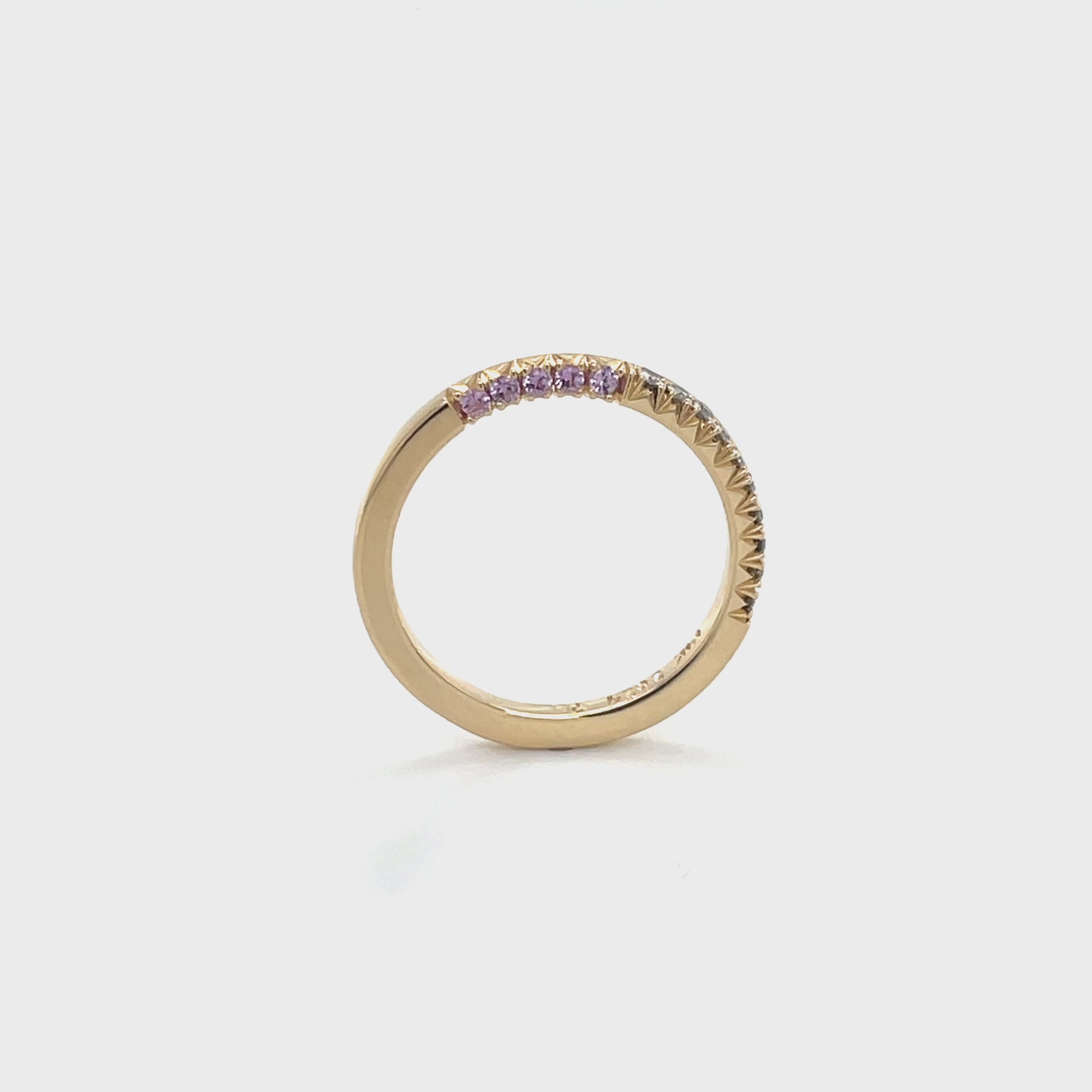 Complement your collection with our stunning 14k Purple Sapphire + Diamond Stacker Band. This exquisite ring features a 14k gold ring band, adorned with vibrant purple sapphires and diamonds intricately set in a classic French cut and fishtail pavé design.