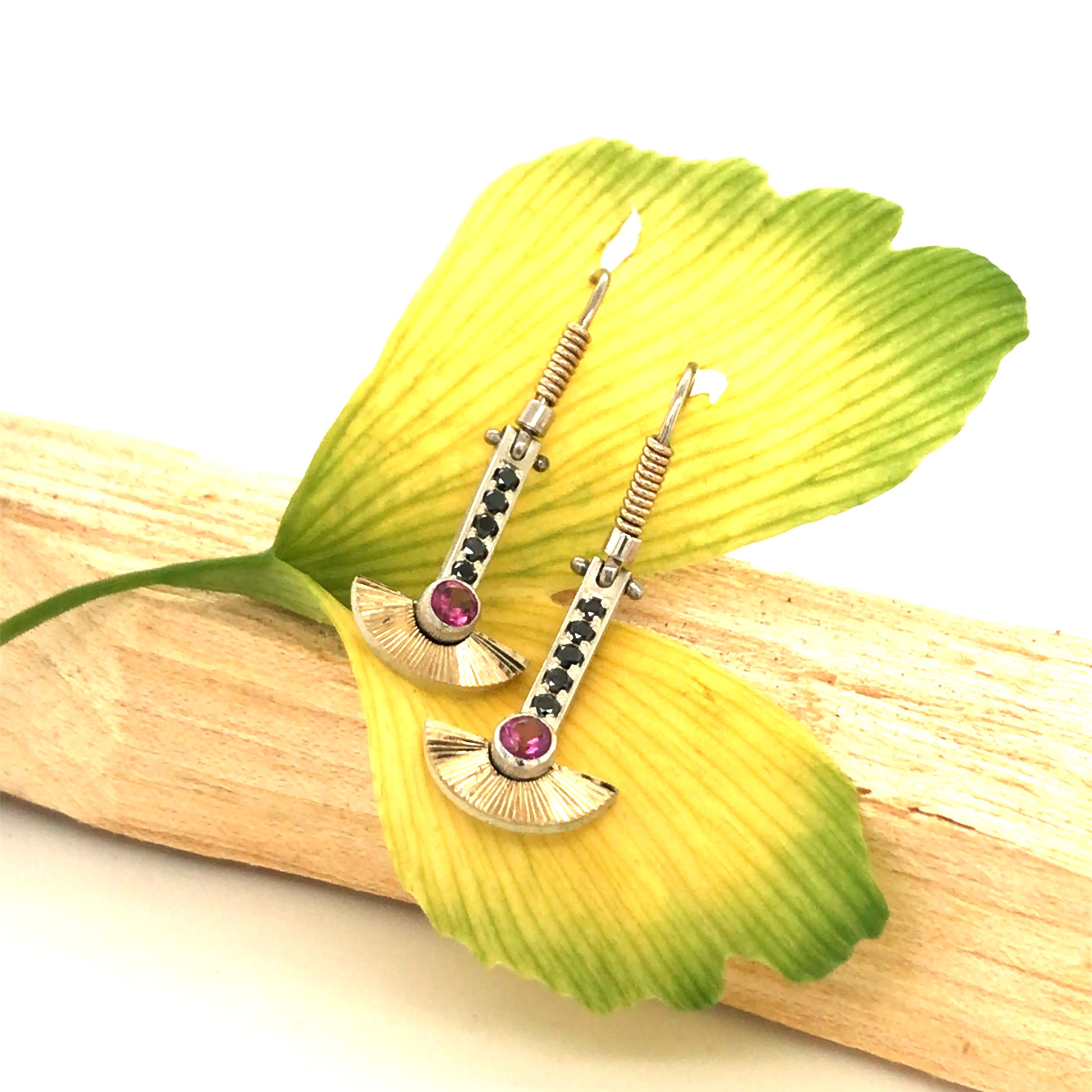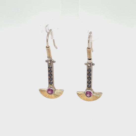 These Rhodolite Garnet + Black Diamond Earrings effortlessly blend elegance with everyday wear. Crafted with a meticulous eye for detail, they showcase a striking pairing of rhodolite garnets and black diamonds set in sterling silver, accented with 14k gold.