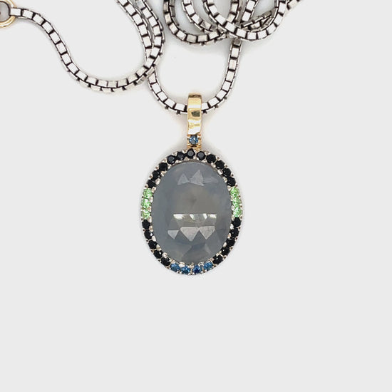 This exquisite Rose Cut Sapphire Pendant is meticulously handcrafted to blend traditional techniques with modern design. At its center is a captivating rose cut sapphire, accented by shimmering black spinels, vibrant blue sapphires, and rich chrome tourmalines—creating a truly distinctive and layered aesthetic.