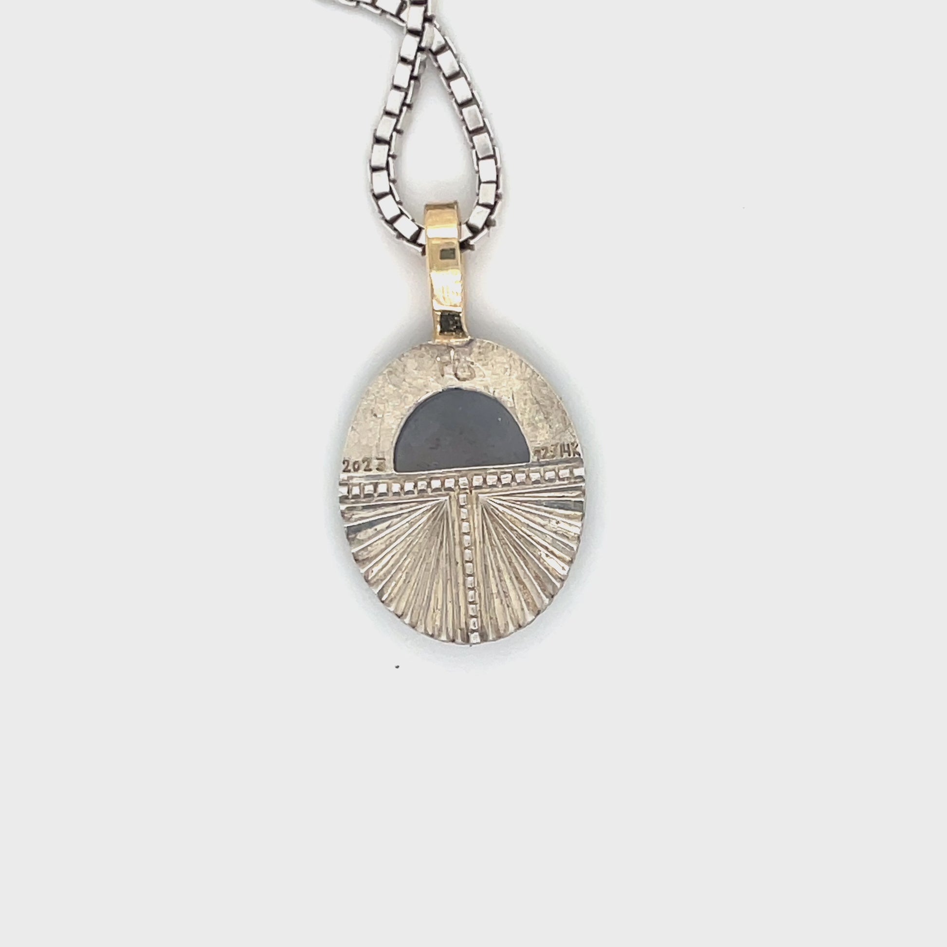Thoughtful details, like hand-engraved bright cuts on the back, add an extra touch of sophistication and showcase the artistry behind the piece. Suspended from a 24-inch diamond-cut sterling silver box chain, this pendant offers versatility for both everyday wear and special occasions.